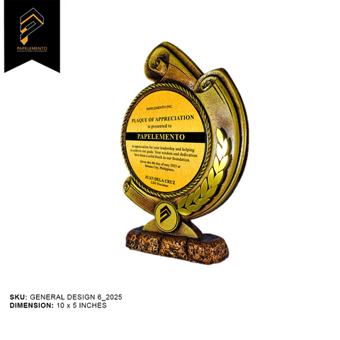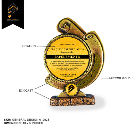 Graceful and dignified, the General Design 6_2025 showcases a circular scroll motif paired with a laurel accent—symbolizing honor, intellect, and victory. Crafted from EcoCast™, Papelemento’s sustainable resin blend, and highlighted with mirror gold finishes, this plaque blends environmental responsibility with timeless elegance.